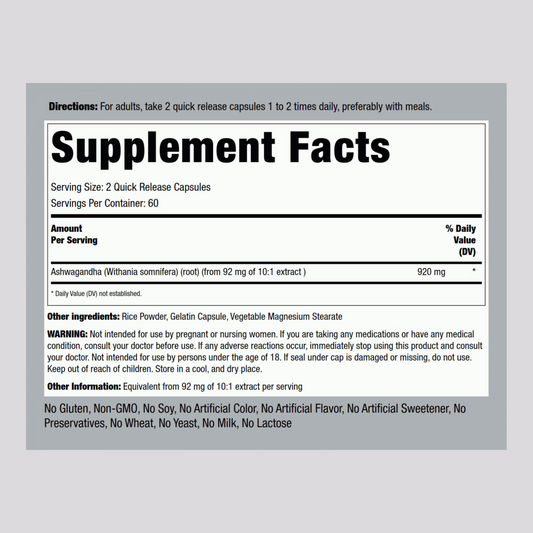 Ashwagandha Root (Withania somnifera), 920 mg (per serving), 120 Quick Release Capsules