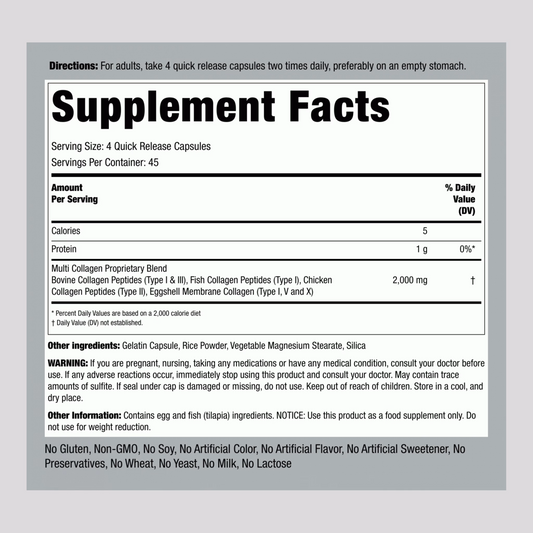 Multi Collagen Protein (Types I, II, III, V, X), 2000 mg (per serving), 180 Quick Release Capsules
