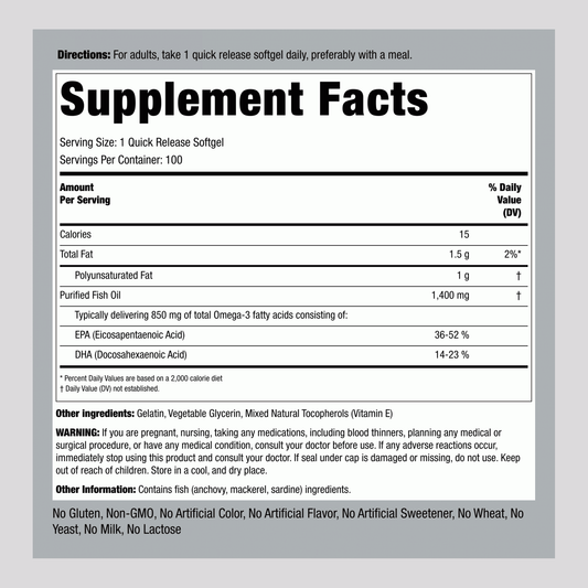 Triple Strength Omega-3 Fish Oil 1400 mg (850 mg Active Omega-3), 100 Quick Release Softgels
